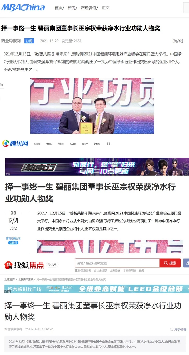 搜狐網(wǎng)、今日頭條、騰訊新聞、南方企業(yè)新聞網(wǎng)、中華網(wǎng)快訊、現(xiàn)代家電網(wǎng)等平臺(tái)深度報(bào)道了碧麗創(chuàng)始人巫宗權(quán)先生在凈水路上的心路歷程,其不為繁華易匠心的高尚品質(zhì)值得被贊頌。