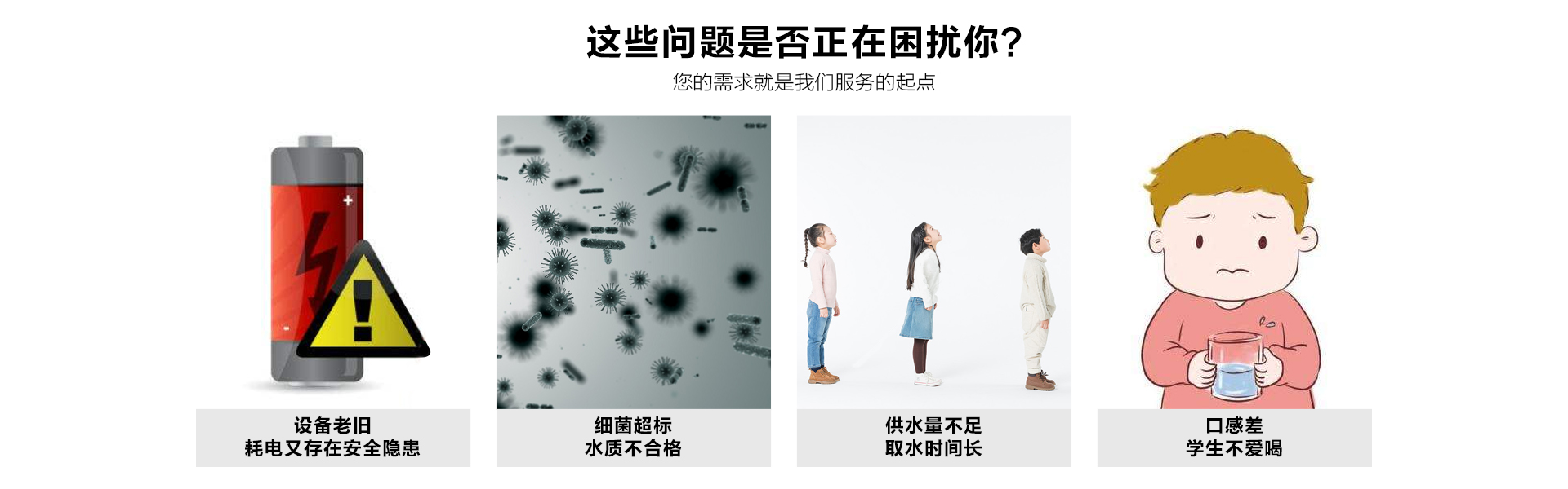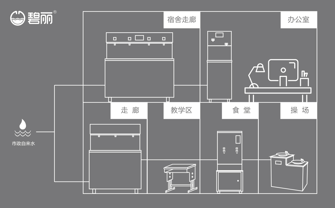 不同的飲水點可根據(jù)實際使用情況,安裝管線機或飲水設(shè)備或開水器,使用戶能喝上開水、溫開水、純凈水等,來滿足不同場景的飲水需求;