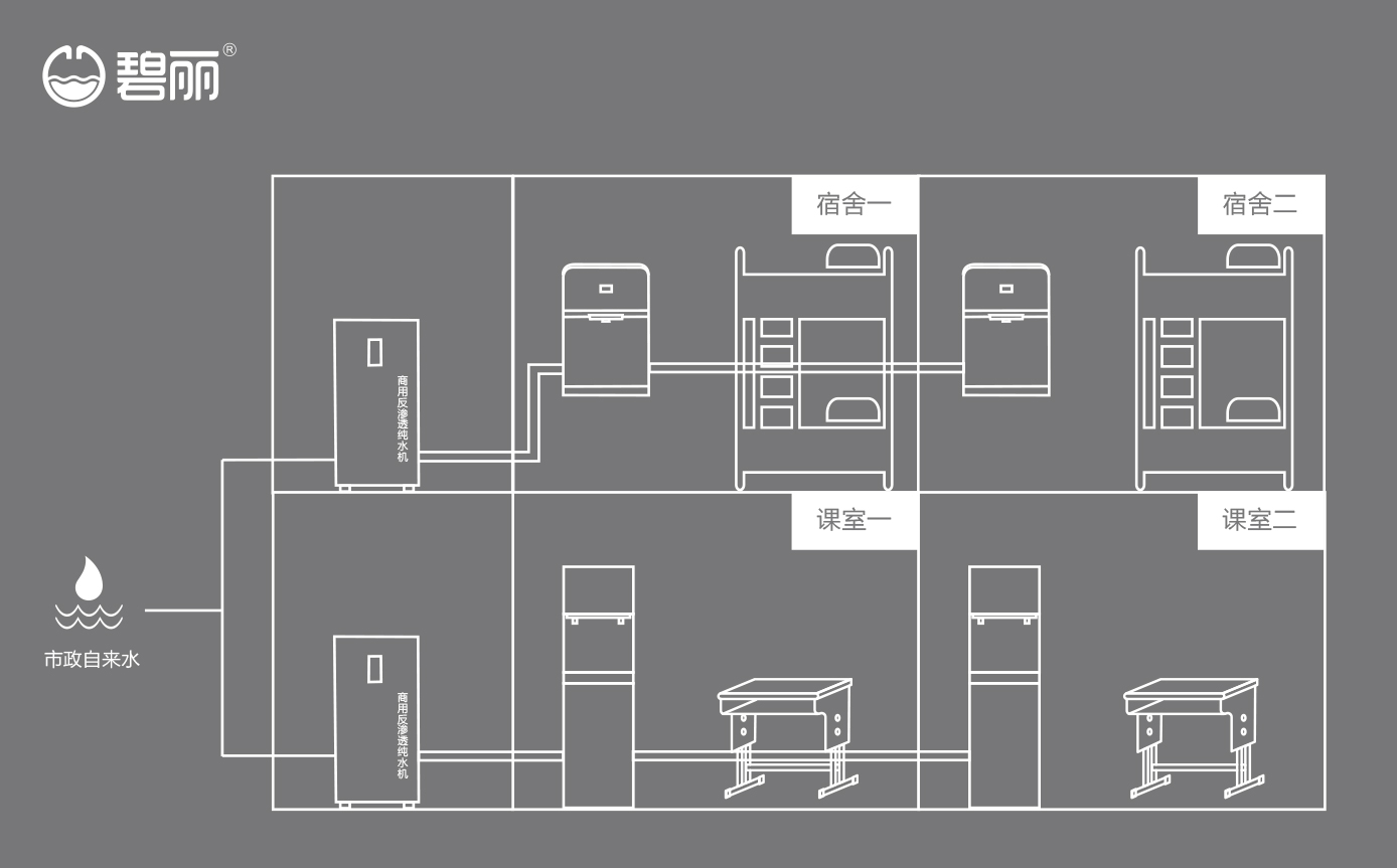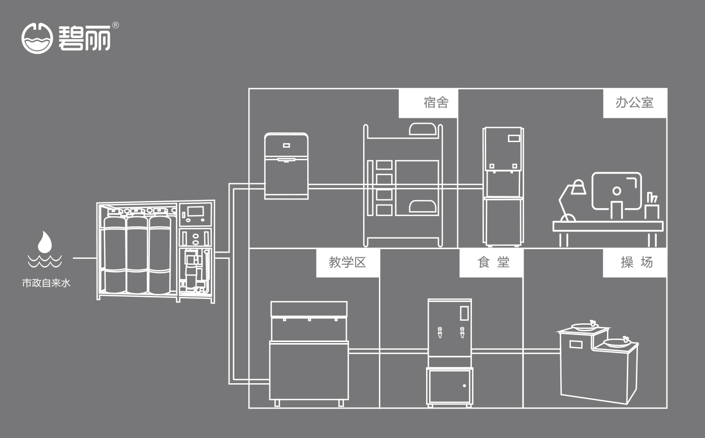 碧麗商用反滲透純水機將自來水集中處理后,把優(yōu)質(zhì)的純凈水通過專用的供水管道輸送到各飲水點;
