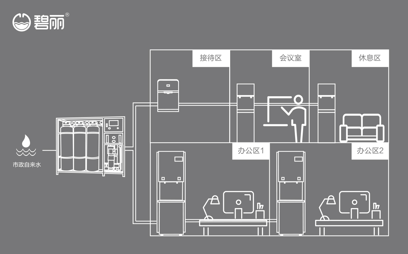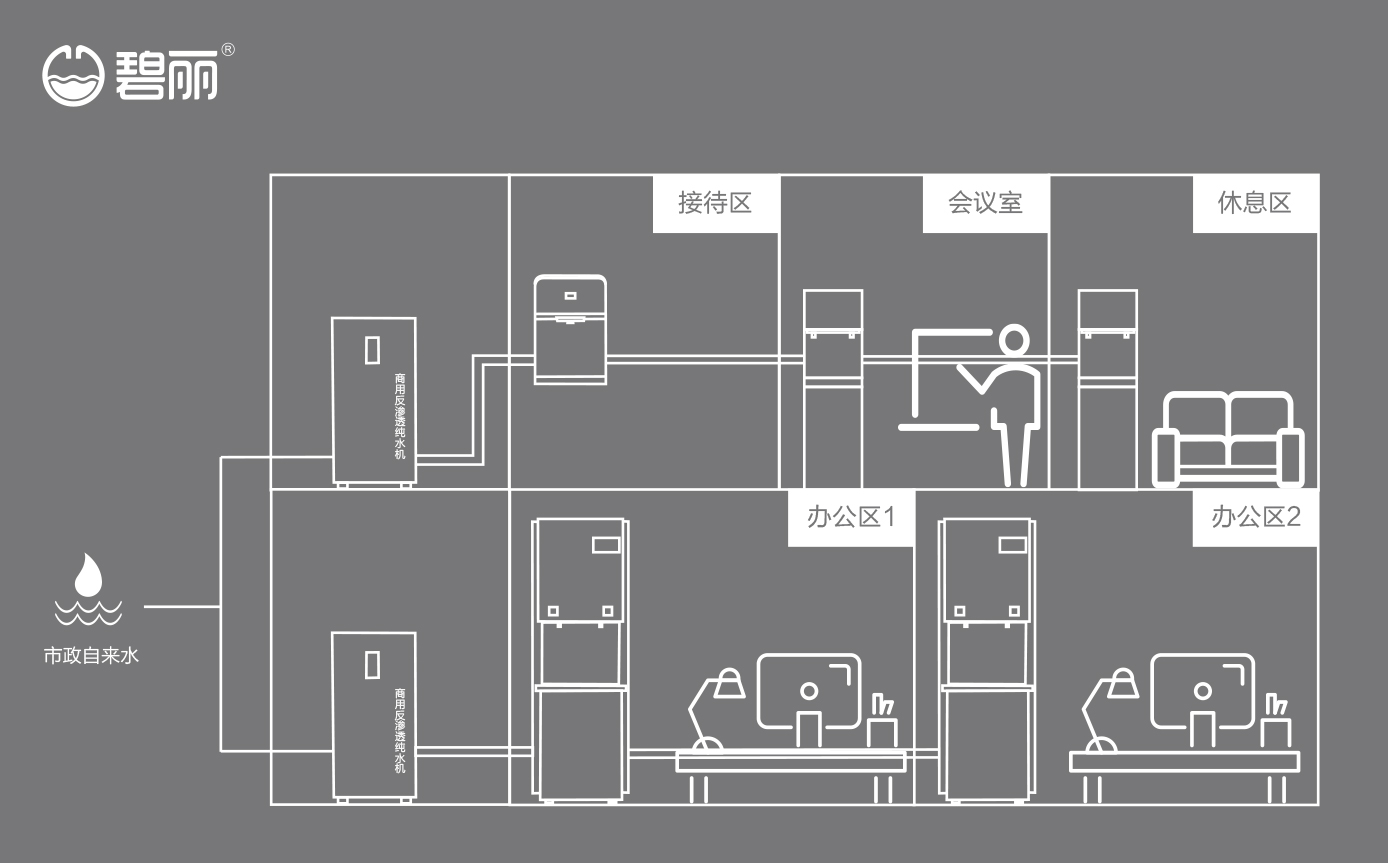 • 碧麗商用反滲透純水機(jī)將自來(lái)水集中處理后,把優(yōu)質(zhì)的純凈水通過(guò)專用的供水管道輸送到各飲水點(diǎn);